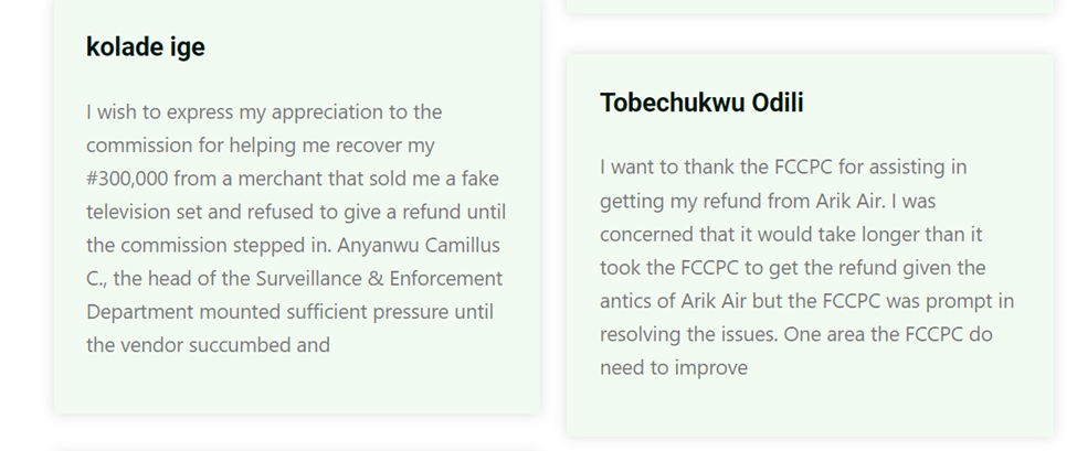 When you go through the Federal Competition and Consumer Commission page, you will see testimonies like those below.