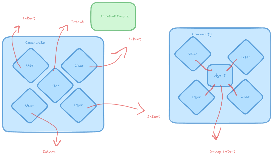 When you only have individual intent parsing (left side), the AI might handle each user’s request but never unify them. By contrast, an agent that focuses on group intent (right side) looks for ways to weave those requests into shared outcomes. It’s the difference between a set of disconnected one-on-one conversations and a collective discussion with a shared objective.