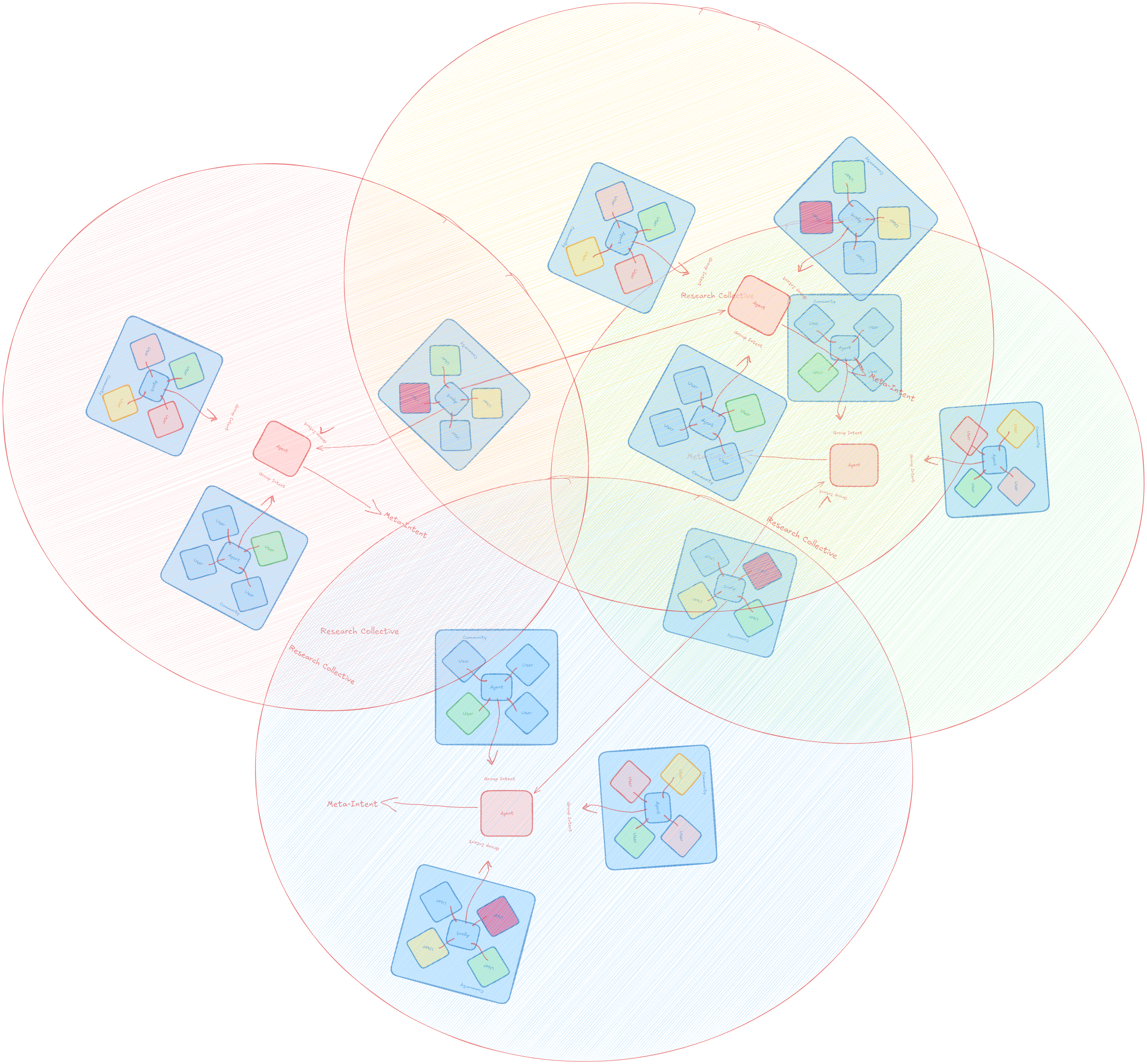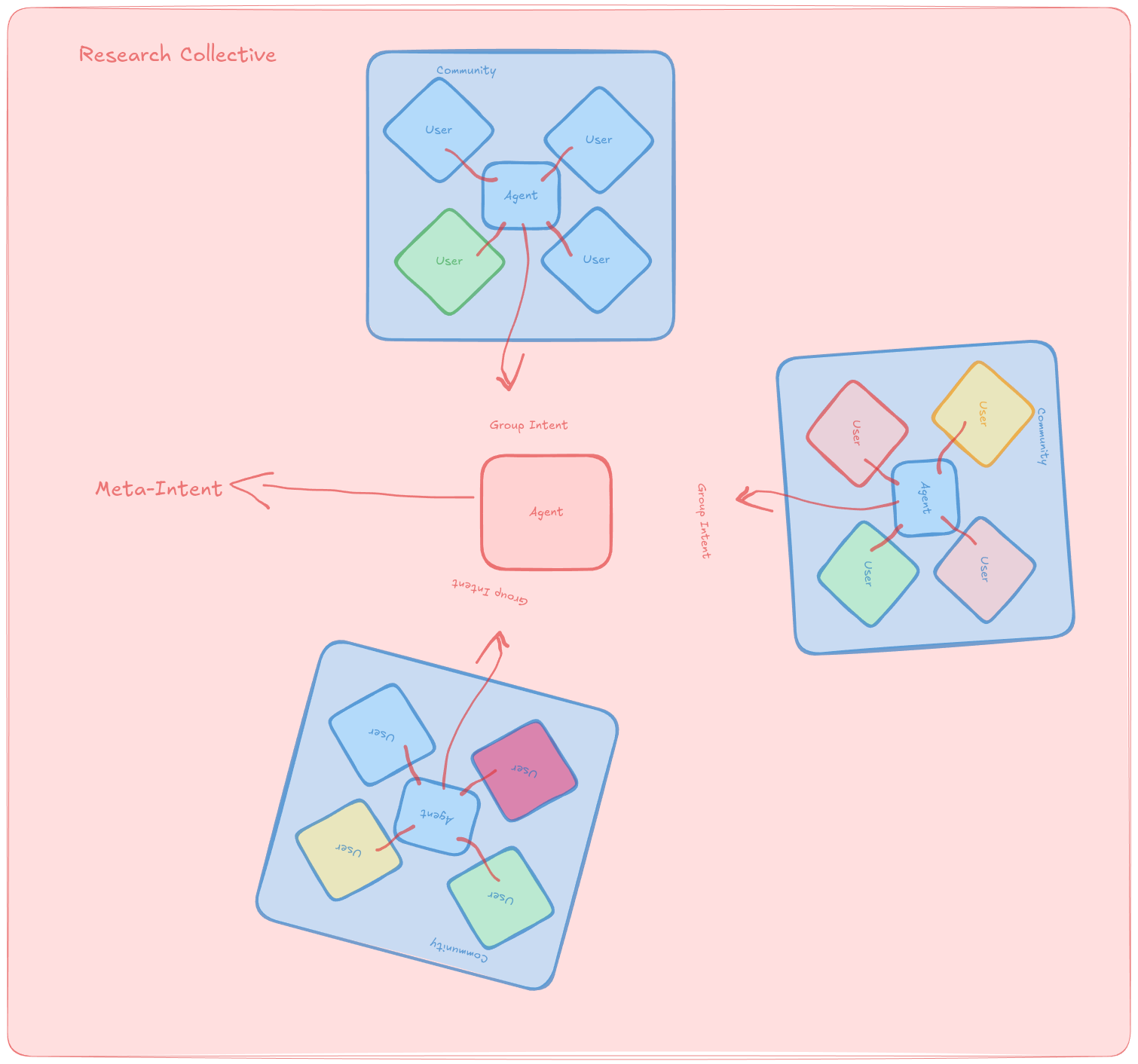 Collectives can coordinate among themselves to refine or align goals, ultimately generating an overarching Group Intent—the consensus or combined mission. This Group Intent is then passed to a higher-level agent (in red in the diagram) which synthesizes everything into a Meta-Intent.