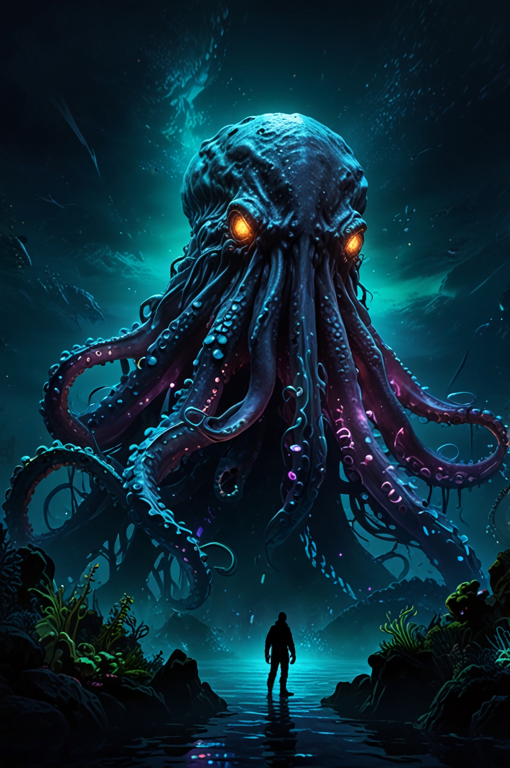 Finally, they reached their destination: a grotesque edifice of bone and coral, a monument to some long-forgotten horror. And there, amidst the macabre architecture, resided Brakjo. A colossal Kraken, from a thousand feet above it's dark eyes fixed upon them with ancient malice. Countless tentacles writhing all around, the smallest had to be at least 200 feet long. As Brakjo approached the waters became almost pitch black.