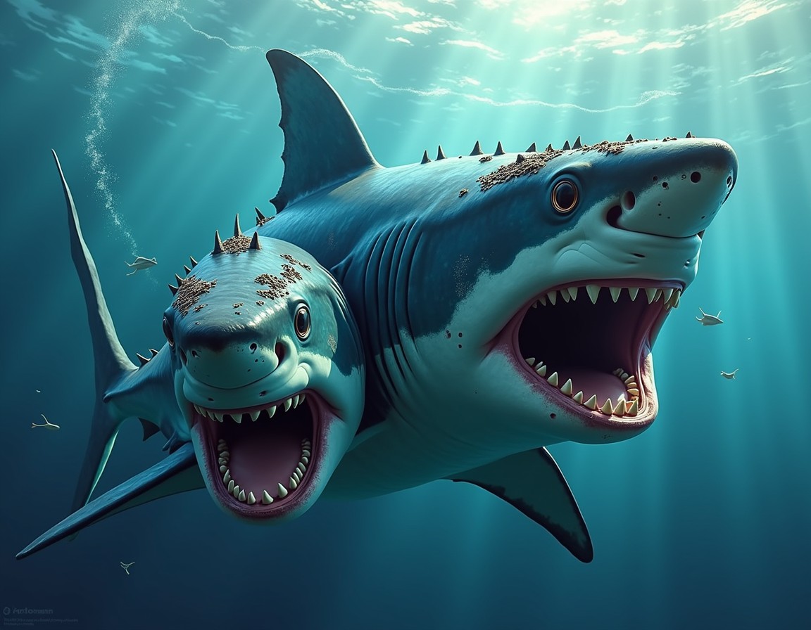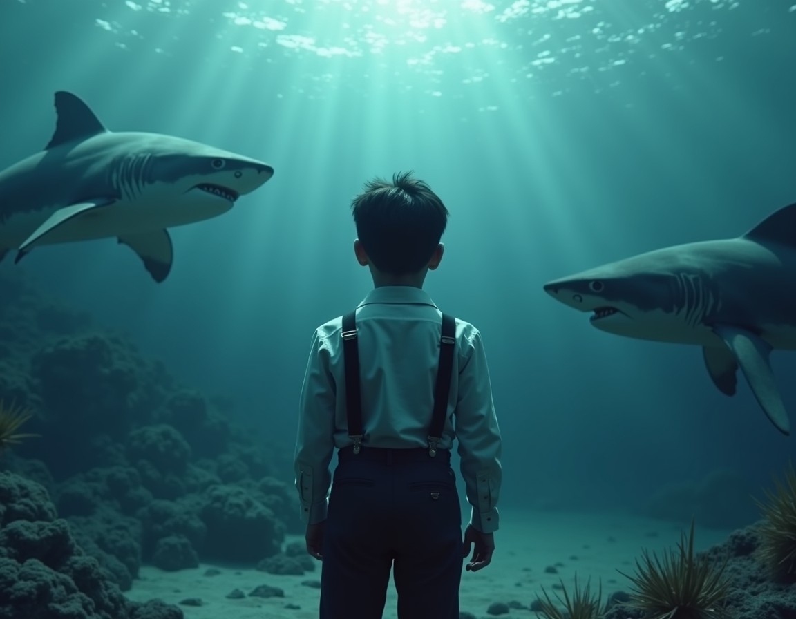 Suddenly, shadows materialized in the gloom. Sharks, but not the playful, harmless creatures of children's stories. These were predators, some with two heads, their eyes burning with a cold, malevolent light. Their teeth, like jagged shards of broken glass, glinted in the dim light. They circled Thomas and the Diver, their precise movements fluid and menacing.