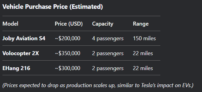 ✔ 2025-2030 will see the first commercial air taxis.✔ Prices will start high ($200K+ per vehicle) but drop with mass adoption.✔ Autonomous eVTOLs will dominate, reducing the need for pilot licenses.✔ Cities like Dubai, LA, and Singapore will lead the rollout.