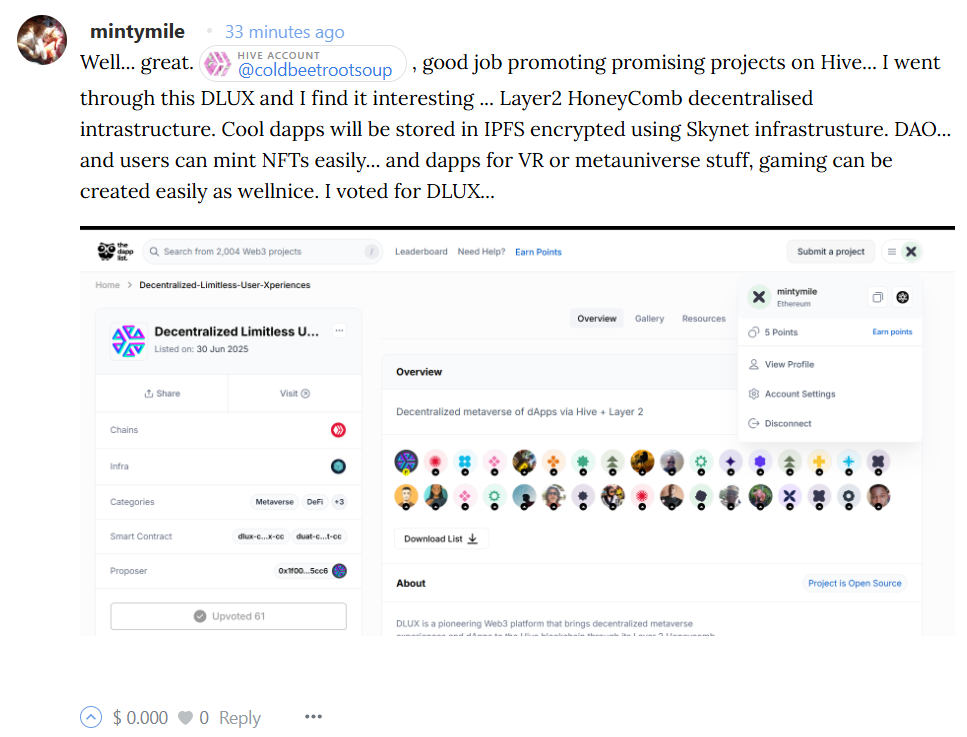 I began to revive my Web3 association by voting for DLUX in #TheDappList portal.